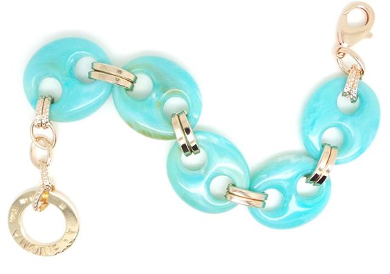bracciale maglia marina, resina colorata e bronzo, chiusura moschettone, lunghezza totale 22 cm, altezza maglia 24 mm