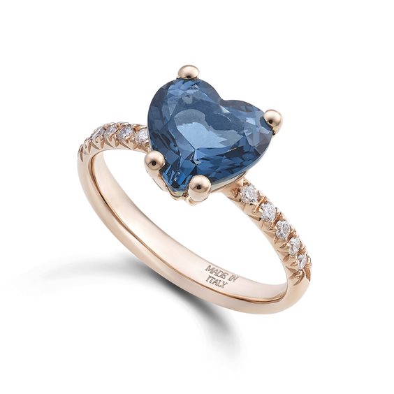 ANELLO ORO ROSA 18K CON DIAMANTI TAGLIO BRILLANTI KT0.12. PIETRA QUARZO BLU LONDON TAGLIO CUORE CT2.86. POSSIBILE IN QUALSIASI ALTRE MISURE SU ORDINAZIONE 10 GG LAVORATIVI