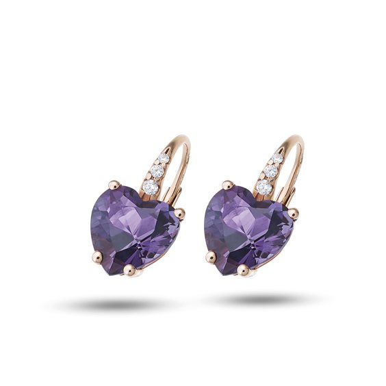 ORECCHINI IN ORO ROSA 18K CON TRE DIAMANTINI TAGLIO BRILLANTE. PIETRA PRINCIPALE AMETISTA A FORMA DI CUORE CT4.34. ORECCHINI A MONACHELLA