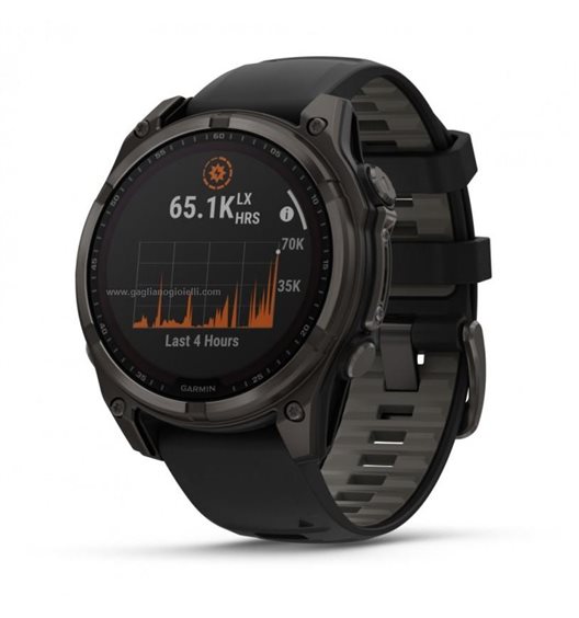 fēnix® 8 - 47 mm, Solar Sapphire, Titanio, Carbon Gray DLC & Black CODICE PRODOTTO010-02906-11 BE LIMITLESS Progettato per fare la differenza, assiste atleti e amanti dell'avventura nel superare i loro stessi limiti, con funzioni avanzate per allenamenti di resistenza e immersioni, altoparlante interno e microfono per i comandi vocali, torcia a LED integrata e una batteria che dura fino a 28 giorni, grazie alla lente di ricarica solare Power Sapphire™1.