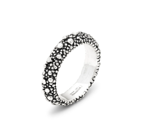 L'anello a fascia Petit Perlage Piccolo celebra il trionfo della fusione a cera persa. I sorprendenti effetti di chiaroscuro sono garantiti dalla diamantatura del pavé di sferette di argento brunito, caratterizzato da una elegante texture contemporanea. Interamente fatto a mano in azienda.