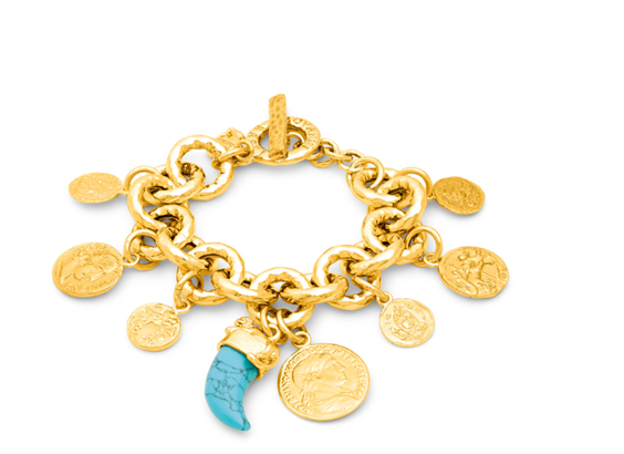 BRACCIALE PUEBLO MONETE CM21 Tutto il fascino della fusione a cera persa in un bracciale a maglia tonda in bronzo dorato con finitura martellata, impreziosito da monete e da una zanna in pasta di turchese sormontata da un decoro a forma di puma. Luminosa e intensa, questa creazione dalle calde cromie è completata da una chiusura a T-bar. Un gioiello fatto a mano, simbolo dell’eleganza materica e della maestria artigianale di Giovanni Raspini.