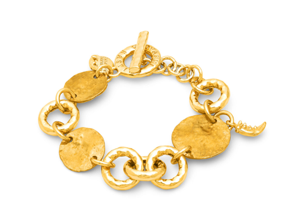 BRACCIALE DAKOTA Il fascino inconfondibile della fusione a cera persa prende forma in un bracciale a maglia tonda in bronzo dorato con finitura martellata, impreziosito da eleganti dischi e da un artiglio. Luminosa e materica, questa creazione dalle calde cromie è completata da una chiusura a T-bar. Un gioiello fatto a mano, espressione dell’arte orafa e della maestria artigianale di Giovanni Raspini.