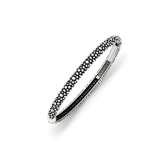 Misura ovale interno 5,4 x 6,4 cm Apertura con molla Fatto a mano in Italia Minimalismo ed eleganza contemporanea per questo bracciale bangle rigido in argento brunito col decoro Perlage. Proposto in un design ovale, particolarmente adatto all'indosso sul polso, è dotato di una comoda apertura a molla laterale. Fatto completamente a mano in home.