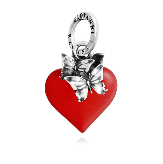 Un raffinato incontro tra passione e leggerezza. Questo charm firmato Giovanni Raspini cattura lo sguardo con un cuore in resina rosso corallo, impreziosito da farfalle in argento brunito realizzate con la tradizionale tecnica della fusione a cera persa. Interamente fatto a mano in azienda.