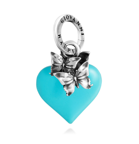 Un raffinato incontro tra passione e leggerezza. Questo charm firmato Giovanni Raspini cattura lo sguardo con un cuore in resina color turchese, impreziosito da farfalle in argento brunito realizzate con la tradizionale tecnica della fusione a cera persa. Interamente fatto a mano in azienda.