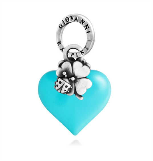 Un simbolo d’amore e di fortuna racchiuso in un charm dal fascino intramontabile. Questo prezioso ciondolo firmato Giovanni Raspini è realizzato a mano in azienda, secondo l’antica tecnica della fusione a cera persa. Il cuore in resina color turchese, intenso e vibrante, è impreziosito da un elegante decoro portafortuna in argento brunito.