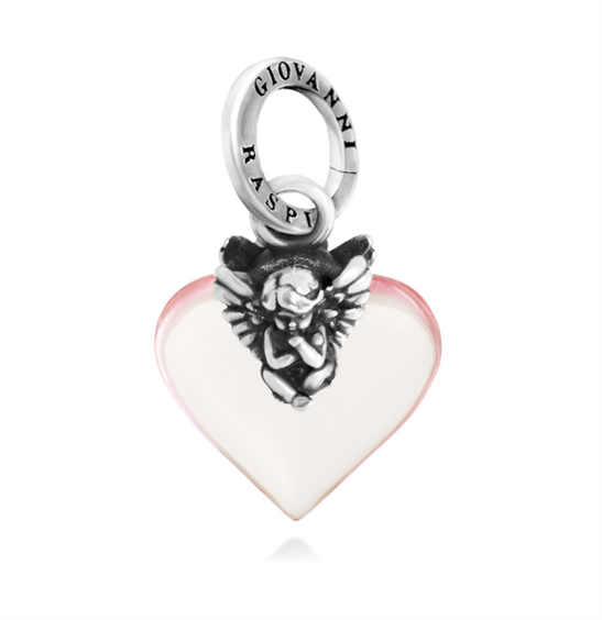 Un’eleganza delicata prende forma in questo charm firmato Giovanni Raspini. Il cuore, realizzato in resina trasparente dal tenue colore rosa, è sormontato da un raffinato angelo in argento brunito, ottenuto attraverso la pregiata tecnica della fusione a cera persa. Interamente fatto a mano in azienda.