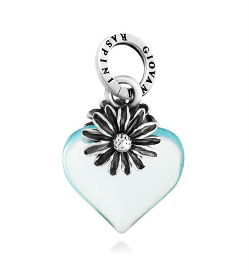Un’eleganza delicata prende forma in questo charm firmato Giovanni Raspini. Il cuore, realizzato in resina trasparente dal tenue colore azzurro, è sormontato da una delicata margherita in argento brunito, ottenuta attraverso la pregiata tecnica della fusione a cera persa. Interamente fatto a mano in azienda.