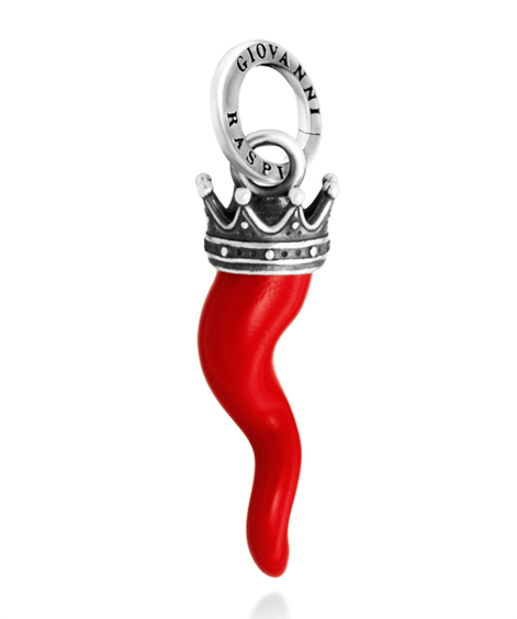 Un raffinato amuleto portafortuna, che unisce tradizione e artigianalità. Questo piccolo corno, realizzato in resina color rosso corallo, è sormontato da una corona in argento fuso secondo l'antica tecnica della fusione a cera persa.