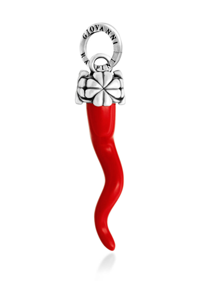 Un raffinato amuleto portafortuna, che unisce tradizione e artigianalità. Questo corno, realizzato in resina color rosso corallo, è sormontato da quadrifogli in argento fuso secondo l'antica tecnica della cera persa.