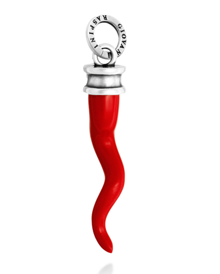Un classico corno portafortuna in resina, color rosso corallo, sormontato da un delizioso cappuccio realizzato in argento fuso a cera persa. Fatto a mano in azienda.