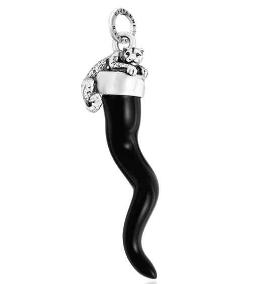 Questo grande corno portafortuna, elemento iconico della tradizione, viene qui proposto in una veste contemporanea: realizzato in resina nera, è impreziosito da un leopardo in argento, ottenuto tramite la raffinata tecnica della fusione a cera persa.