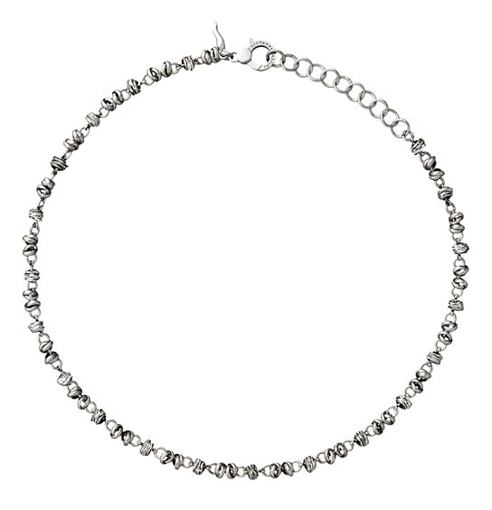 Un indosso facile e leggero, per una collana dai tanti spunti di design. Fatta a mano completamente in argento, su una base di sezioni realizzate in fusione a cera persa si susseguono maglie a "nodino" ed elementi bruniti, creando una grande armonia compositiva. Il tocco finale è dato dalla tecnica della diamantatura su questi ultimi, che dona sorprendenti riflessi di luce.