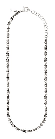 Collana Joy. Su una base di sezioni costruite con la tradizionale tecnica della fusione a cera persa, si susseguono con ritmo coppie di maglie intrecciate. Un indosso delicato ed elegante, prezioso grazie alla cura delle lavorazioni artigianali di Giovanni Raspini. Realizzata interamente a mano in azienda.