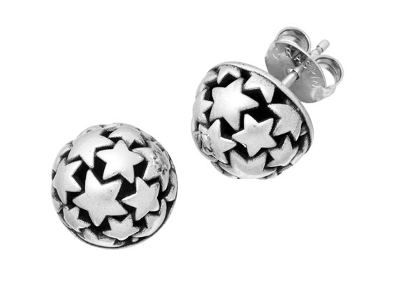 Questi orecchini in argento sono caratterizzati dalla loro forma sferica con raffigurazione di stelle in argento brunito. Regalano un indosso leggero e prezioso e sono fatti completamente a mano in azienda.