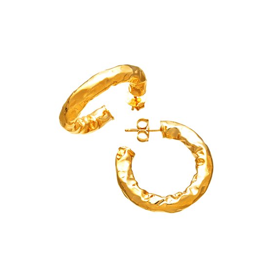 Elegantissimi e contemporanei, gli orecchini Stone riflettono la luce naturale illuminando il volto con calde sfumature dorate. Fatti completamente a mano in azienda, sono realizzati in lastra d'argento martellata a mano e piegata, e infine bagnati nell'oro.