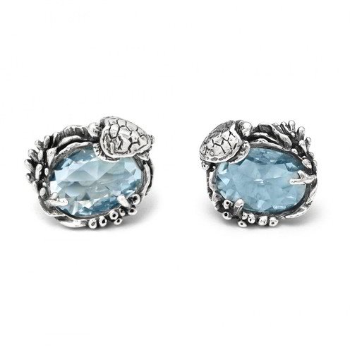 Realizzati completamente a mano, in argento brunito, questi orecchini testimoniano tutto l'amore di Giovanni Raspini per il mondo marino, mettendo insieme tradizione e bellezza. L'argento, fuso a cera persa, incontra la delicatezza coloristica del quarzo color azzurro acquamarina. Fatti completamente a mano.