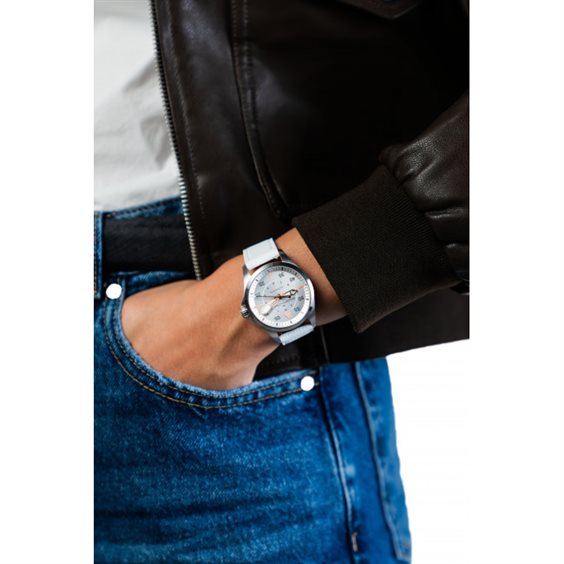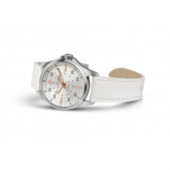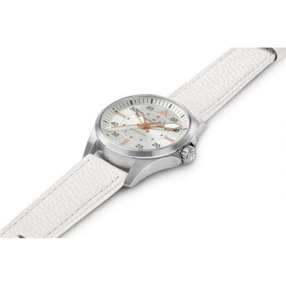 Hamilton Khaki Aviation Pilot H76215850 Ampliando la popolare linea Khaki Aviation, Hamilton introduce una nuova collezione Pilot, realizzata per i veri amanti dell'aviazione. Il nuovo Khaki Pilot Automatico evoca lo spirito di esplorazione e avventura del Khaki. Il modello presenta una cassa da 36 mm in acciaio inossidabile e uno spessore da 11.15 mm, rispondendo alla tendenza degli orologi più piccoli. Sottolineando la personalità del tool watch, la cassa è per lo più spazzolata con sottili accenti lucidi alla base della lunetta e sulla "H" sulla corona. Pur rispettando gli standard di precisione per la cabina di pilotaggio, questi design più compatti sono perfetti per le avventure di tutti i giorni. Il quadrante è argentato, e per migliorarne la leggibilità, i tre indici rettangolari larghi e allungati alle ore 3, 6 e 9 e il grande triangolo di orientamento a mezzogiorno sono trattati con Super-LumiNova. Completano le lancette luminose delle ore e dei minuti a forma di spada. A protezione del quadrante troviamo un vetro zaffiro resistente agli urti. Il cuore dei modelli da 36 mm sono alimentati dal movimento automatico H-10, con spirale resistente ai campi magnetici e riserva di carica di 80 ore. Il modello è resistente all'acqua fino a 100 metri. Il Khaki Pilot Auto è abbinato ad un cinturino in pelle bianco.