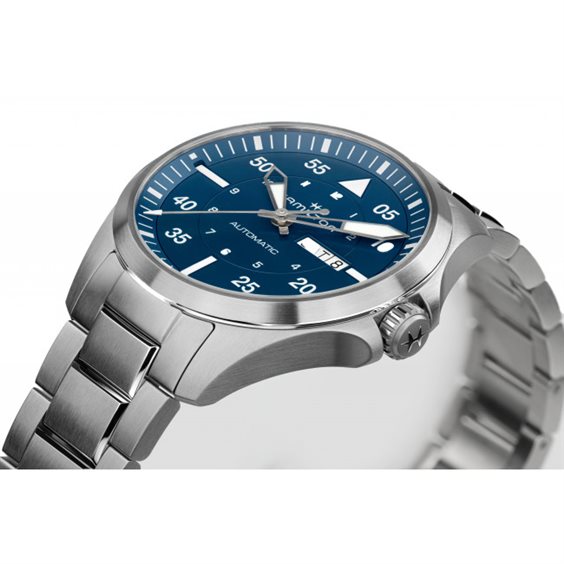 Hamilton Khaki Aviation Pilot H64635140 Ampliando la popolare linea Khaki Aviation, Hamilton introduce una nuova collezione Pilot, realizzata per i veri amanti dell'aviazione. Il nuovo Khaki Pilot Automatico evoca lo spirito di esplorazione e avventura del Khaki. Il modello presenta una cassa da 42 mm in acciaio inossidabile e uno spessore da 12.1 mm. Pur rispettando gli standard di precisione per la cabina di pilotaggio, questi design più compatti sono perfetti per le avventure di tutti i giorni. Il quadrante è di colorazione blu, e per migliorarne la leggibilità, i tre indici rettangolari larghi e allungati alle ore 3, 6 e 9 e il grande triangolo di orientamento a mezzogiorno sono trattati con Super-LumiNova. Completano le lancette luminose delle ore e dei minuti a forma di spada. Questo modello presenta sul quadrante un datario e dei numeri sovradimensionati. A protezione del quadrante troviamo un vetro zaffiro resistente agli urti. Il cuore dei modelli da 42 mm sono alimentati da un calibro automatico Hamilton H-30, che è un ETA C07.111 leggermente modificato noto anche come Powermatic 80 con una spirale Nivachron, una riserva di carica di 80 ore e una complicazione giorno-data.. Il modello è resistente all'acqua fino a 100 metri. Il Khaki Pilot Auto è abbinato ad un intramontabile bracciale in acciaio inossidabile.