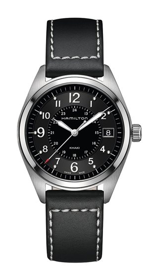 Orologio uomo solo tempo, cassa in acciaio, cinturino nero in pelle, quadrante nero con datario, indici arabi 12-24 ore vetro zaffiro, movimento al quarzo, impermeabile 5 bar (50 metri). Prodotto nuovo e originale, munito di manuale di istruzioni e GARANZIA INTERNAZIONALE Hamilton di 24 mesi.