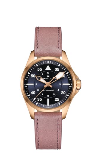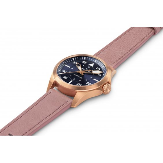 Hamilton Khaki Aviation Pilot H76245840 Ampliando la popolare linea Khaki Aviation, Hamilton introduce una nuova collezione Pilot, realizzata per i veri amanti dell'aviazione. Il nuovo Khaki Pilot Automatico evoca lo spirito di esplorazione e avventura del Khaki. Il modello presenta una cassa da 36 mm in acciaio inossidabile con rivestimento in PVD oro rosa e uno spessore da 11.15 mm, rispondendo alla tendenza degli orologi più piccoli. Sottolineando la personalità del tool watch, la cassa è per lo più spazzolata con sottili accenti lucidi alla base della lunetta e sulla "H" sulla corona. Pur rispettando gli standard di precisione per la cabina di pilotaggio, questi design più compatti sono perfetti per le avventure di tutti i giorni. Il quadrante è di colorazione blu, e per migliorarne la leggibilità, i tre indici rettangolari larghi e allungati alle ore 3, 6 e 9 e il grande triangolo di orientamento a mezzogiorno sono trattati con Super-LumiNova. Completano le lancette luminose delle ore e dei minuti a forma di spada. A protezione del quadrante troviamo un vetro zaffiro resistente agli urti. Il cuore dei modelli da 36 mm sono alimentati dal movimento automatico H-10, con spirale resistente ai campi magnetici e riserva di carica di 80 ore. Il modello è resistente all'acqua fino a 100 metri. Il Khaki Pilot Auto è abbinato ad un cinturino in pelle rosa.