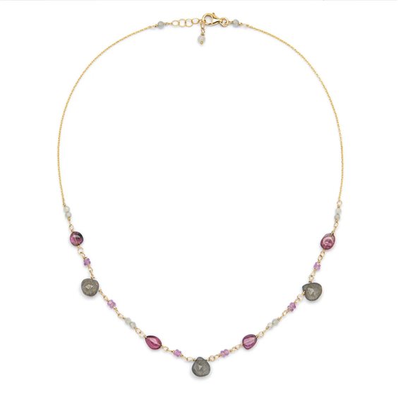 La collana ha una parte centrale realizzata con tormaline rosa e labradoriti lavorate a rosario ed ha una circonferenza di 41cm regolabile fino a 43cm. La catena è una forzatina battuta.