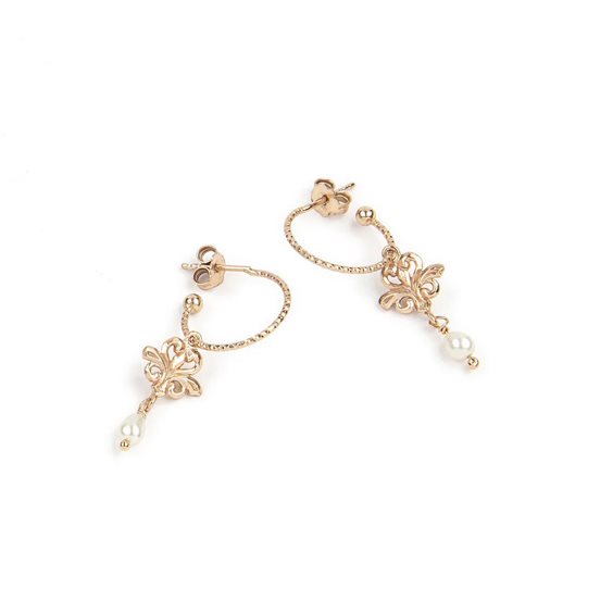Orecchini della collezione Blanche con cerchietto e perno a lobo con pendente a forma di giglio brunito e perla naturale bianche di circa 7mm. Il cerchietto ha un diametro di 1.5cm e la lunghezza complessiva degli orecchini è di 4cm