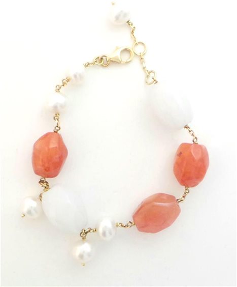 bracciale in oro giallo con inserti e parti pendenti con perle e pietre naturali, chiusura a moschettone e lunghezza totale 19cm