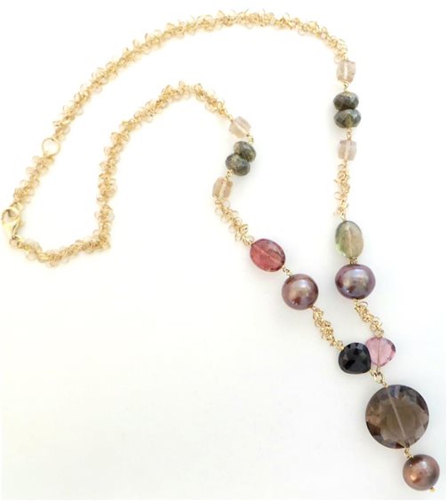 collana in oro giallo 18kt, con maglia ad intreccio ed inserti in pietre e perle naturali di diversi colori, chiusura a moschettone, lunghezza totale cm 47cm