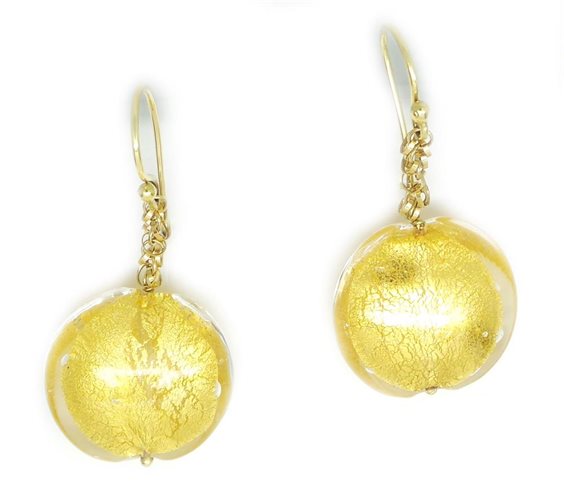 Orecchini in oro giallo 18 kt con pendente murrina e chiusura ad amo, lunghezza totale 4,5 cm.