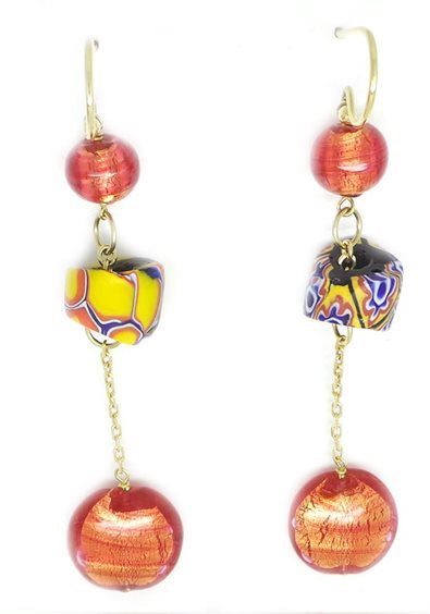 Orecchini in oro giallo 18 kt con murrine veneziane pendenti lunghezza 8 cm, chiusura ad amo.
