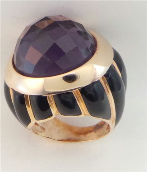 Anello in argento placcato oro rosa con quarzo ametista naturale sfaccettato ovale e bombato 16mm X 18mm, e smalti.