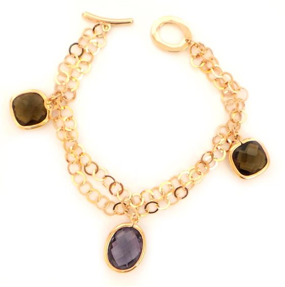 bracciale in argento laminato oro rosa, con charmes appesi in cristalli naturali ametista e grigio fumo, chiusura a paletto, lunghezza totale 19,5cm