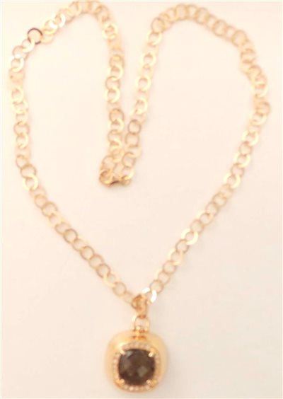 Collana in argento ad anelli laminata oro rosa lunghezza 43cm, con pendente in argento laminato oro rosa, con quarzo grigio fumo e contorno di zirconi, retro finemente lavorato, diametro 2,2cm