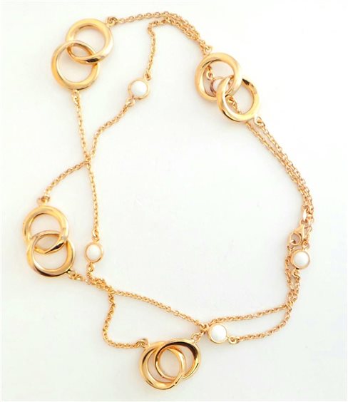 collana in argento laminato oro rosa con anelli intrecciati e pietre naturali in agata bianca sfaccettate, lunghezza totale 66cm