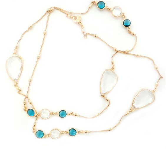 Collana in argento laminato oro rosa lunga 88cm, con maglia grumette e inserti in agata taglio cabochon e cristallo di rocca taglio sfaccettato, chiusura a moschettone