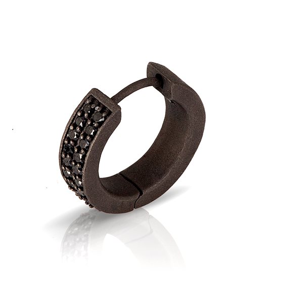 Orecchino uomo in titanio e diamanti black. Il cerchietto in titanio è il protagonista di questo orecchino. Sulla sua superficie anteriore sono incastonati , disposti su due file,18 diamanti black per una caratura totale di 18 punti. All'interno si trova il diamante black da 1 punto simbolo del marchio MANO|J.