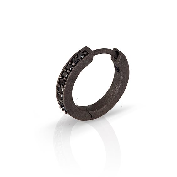 Orecchino uomo in titanio e diamanti black. Il cerchietto in titanio è il protagonista di questo orecchino. Sulla sua superficie anteriore sono incastonati 9 diamanti black per una caratura totale di 9 punti. All'interno si trova il diamante black da 1 punto simbolo del marchio MANO.