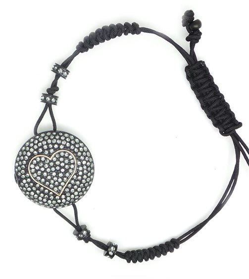 è orologio bracciale con cassa double face, da una parte orologio con contorno di zirconi, dall'altra pavè di zirconi a forma di cuore, cinturino con chiusura scorrevole in tessuto nautico, cassa pvd nero