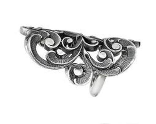 L'anello da falange in argento brunito inciso evoca il gusto di mondi lontani. Questo anello è un'accattivante creazione dallo stile non convenzionale. Per una donna che ama indossare gioielli dalla briosa e irriverente eleganza. Lunghezza: 4 cm Materiale: argento 925 brunito Realizzazione: Italia