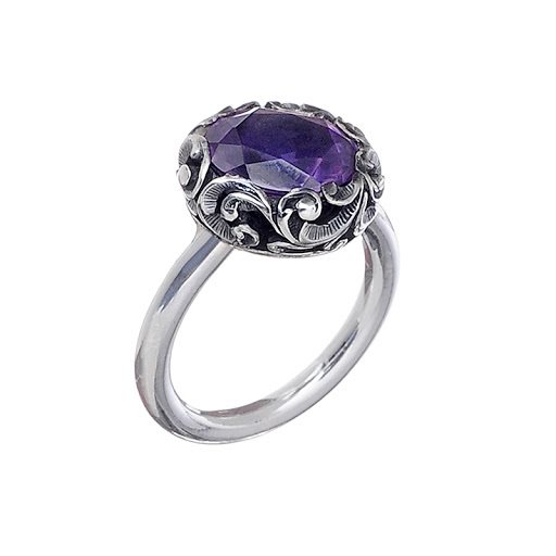 Anello in argento brunito inciso a mano con l’antica tecnica del bulino e pietra taglio ovale, gambo in argento lucido con ametista naturale.