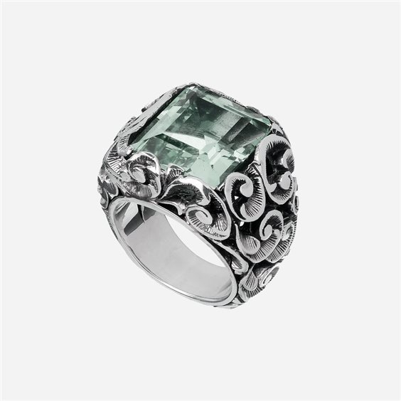 Anello in argento brunito inciso a mano e pietra taglio smeraldo COLORE PRIASOLITE