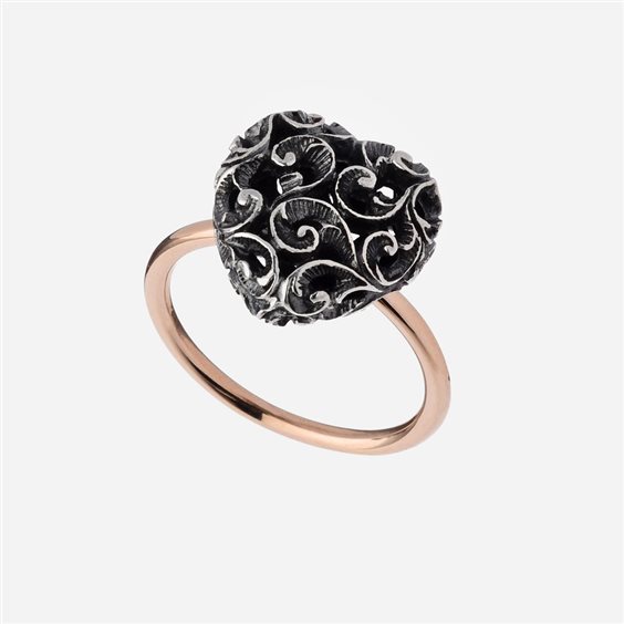 Questo anello della collezione Shakti Love presenta un cuore intagliato in argento brunito e gambo liscio in ora rosa 9 carati.