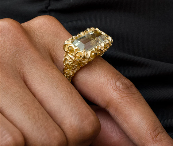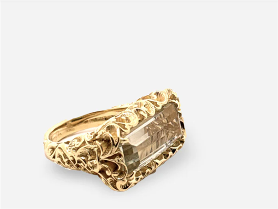 Anello in argento placcato oro con pietra solitario dal taglio baguette in Quarzo Fumè naturale. Il taglio rettangolare allungato della pietra regala geometrie decise e di carattere. Pietra: 20x10 mm Materiale: argento 925, oro 18kt Realizzazione: Italia