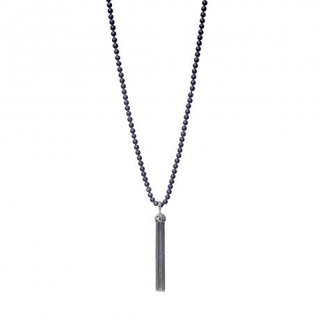 Collana lunga decorata con 132 sfere di onice satinate dal diametro di 6 mm. Al centro è impreziosita da una nappina in argento brunito inciso a mano con l'antica tecnica del bulino. Un accessorio raffinato e importante di cui non puoi fare a meno.