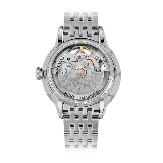 Movimento Scheletrato – Riserva Di Carica Fino A 80 Ore – Vetro Zaffiro Antiriflesso Per la prima volta, Mido ha creato un orologio scheletrato dedicato in particolare alle donne. Il nuovo e audace Rainflower Blossom presenta linee delicate, direttamente ispirate alla forma del fiore di loto dell’ArtScience Museum di Singapore. Petali decisamente femminili si intrecciano lungo i bordi. Ornato da un fiore traforato, l’accattivante quadrante rivela al centro il Calibro 80, il movimento automatico di ultima generazione, la cui platina è stata appositamente scheletrata e decorata, che invita chi lo indossa a meravigliarsi dello scorrere del tempo con audacia ed eleganza.