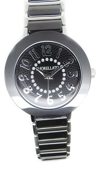orologio in acciaio e ceramica diametro 30mm. quadrante con strass e numeri leggibili, bracciale ceramica e acciaio con chiusura deployante a pulsanti, movimento quartz