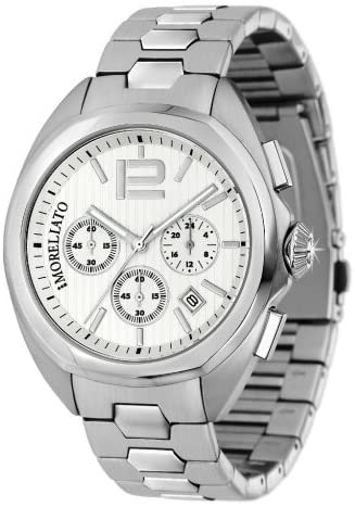 orologio in acciaio chrono, quadrante bianco argento con lavorazione a righe, bracciale in acciaio con chiusura deployante, diamante naturale incastonato sulla corona di regolazione, movimento quartz , water resistant 10 atm