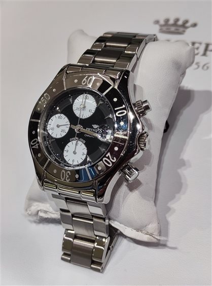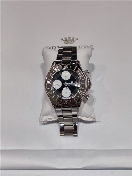 orologio cassa in acciaio diametro 40 mm, con bracciale acciaio con doppia chiusura di sicurezza, movimento meccanico a carica automatica con movimento svizzero valjoux 7750, vetro minerale con lente di ingrandimento sulla data, corona girevole unidirezionale e pulsanti del crono a vite.